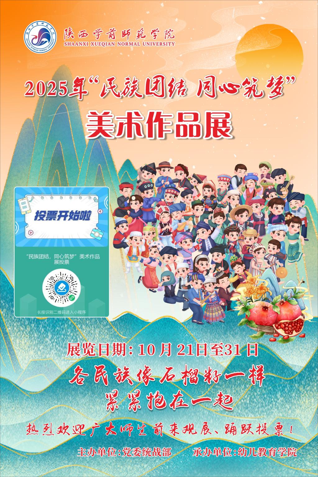 2025年“民族团结 同心筑梦”美术作品展览已由幼儿教育学院在图书馆二楼大厅布展完毕,并已举办开幕式。请积极组织动员学生特别是2025级新生前去观展,作为入学教育重要一课,同时积极参加线上投票活动,10月30日前将集体观展照片2至3张发至邮箱:ssydwtzb@snsy.edu.cn